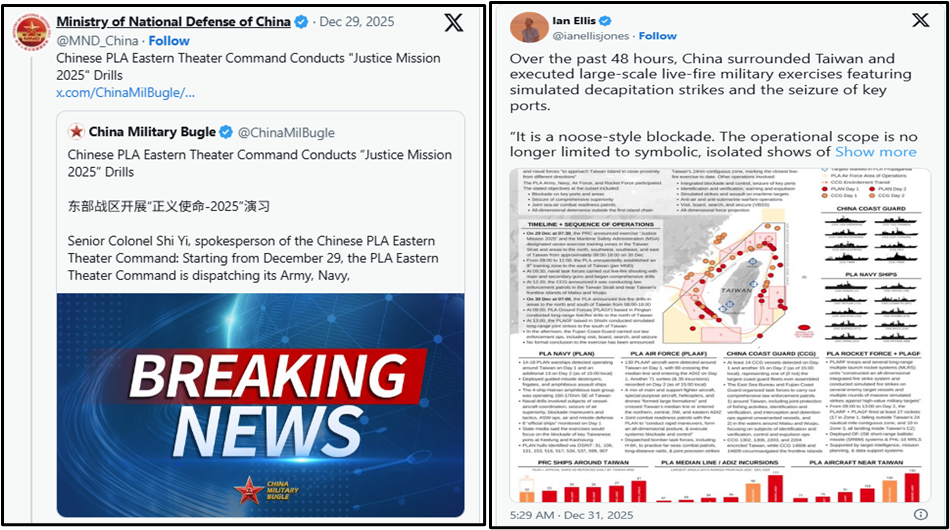According to the Global Taiwan, on 29–30 December 2025, the PLA Eastern Theater Command launched “Justice Mission 2025,” a large‑scale joint exercise encircling Taiwan with air, naval, rocket and coast guard forces. Seven danger zones were declared around the island, effectively surrounding Taiwan and overlapping with key approaches to its major ports.