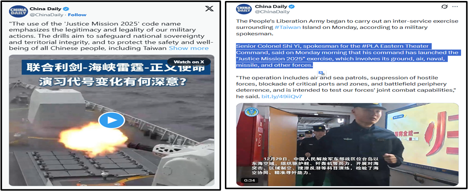 PLA officials framed the December 2025 drills as resolutely punitive and deterrent. Eastern Theater Command Spokesperson Senior Colonel Shi Yi called it a “stern warning” against “Taiwan independence separatists and external interference.” China Military Bugle declared reunification “how and when, not if,” with graphics depicting Taiwan bound in chains under slogans vowing to “punish Taiwan independence” and “deter external meddling.”